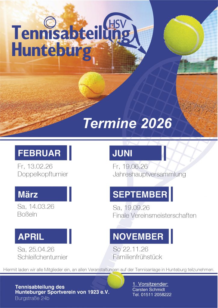 Termine der Tennisabteilung 2026 Veröffentlicht am 13. Januar 202613. Januar 2026 von Franziska Kückmann Doppelkopf-Turnier, Boßeln, Vereinsmeisterschaften, Familienfrühstück: Auf und neben dem Platz hat die Tennisabteilung in 2026 viel vor! Veröffentlicht in Der HSV, Tennis.